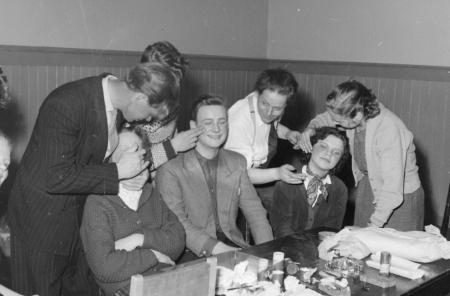Sminkkurs i Pargas år 1957. På bild: Reinhold Weckström, Göran Gröönros. Resten icke-identifierade.