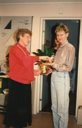 Vivan Bäckströms avskedsfest. Överräker sin nyckel åt förb. sekr. Mona Lehtonen på sin avskedsfest den 25.1. 1991.